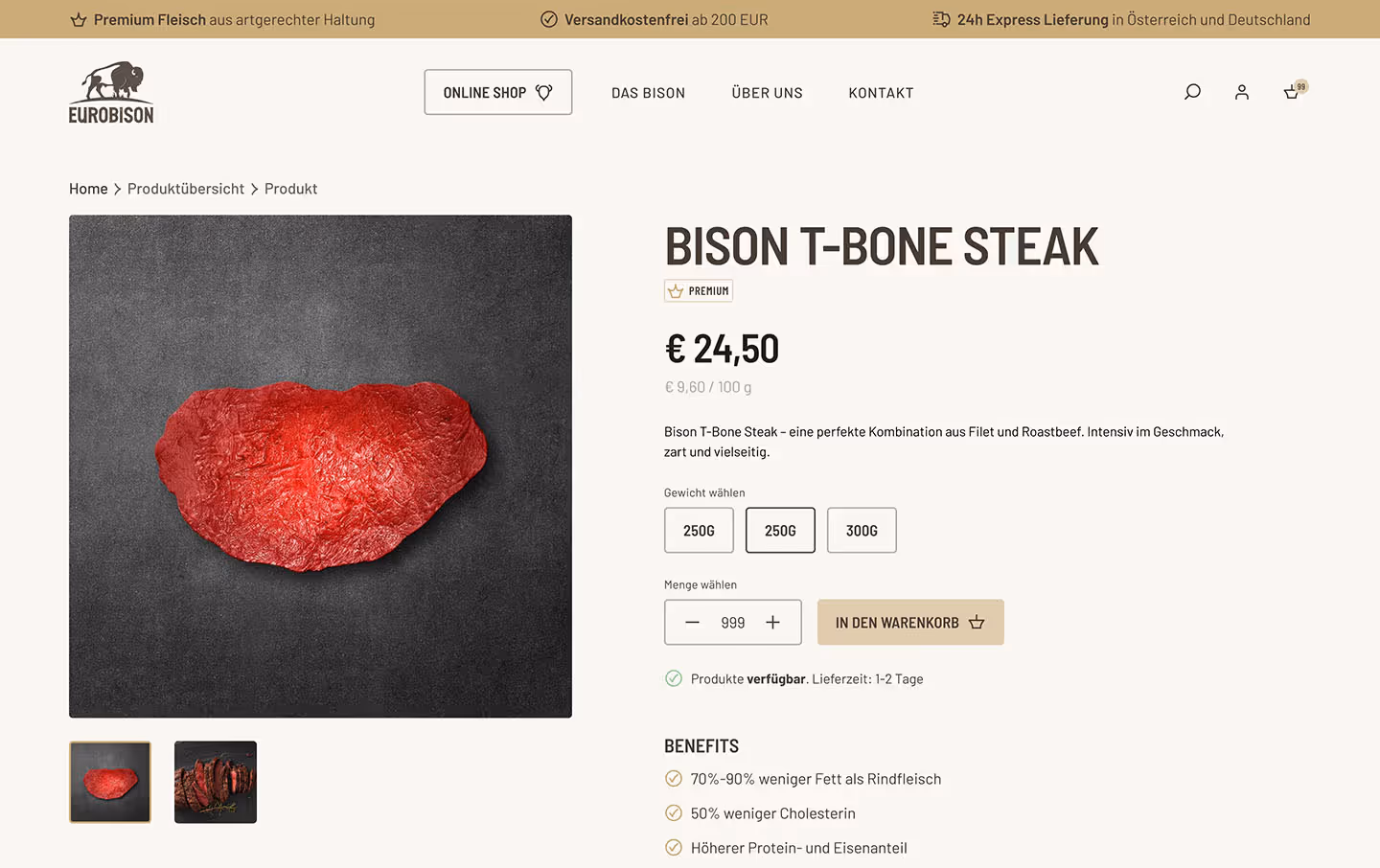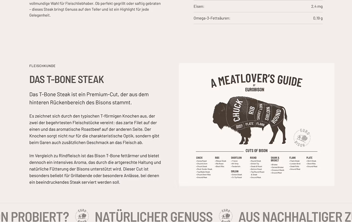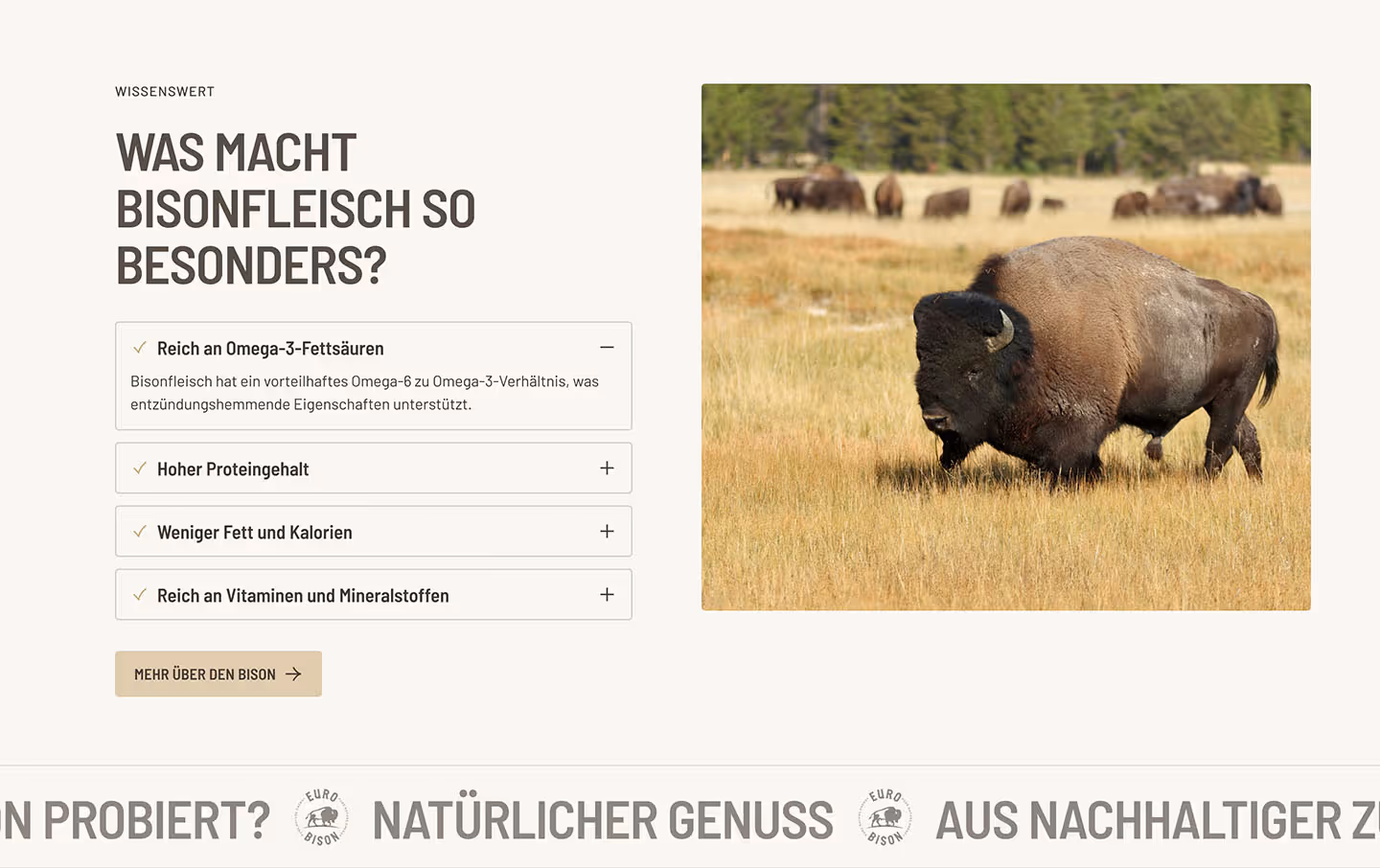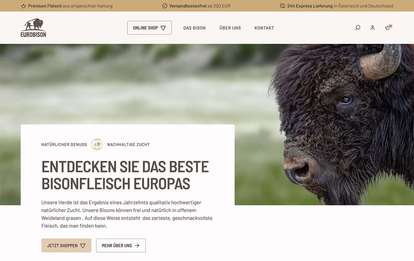 Eurobison had established itself as Austria's premium bison meat provider, but their digital presence wasn't reaching its full potential. The existing website created barriers for users with disabilities, limiting access to their sustainable, high-quality products. With complex navigation, insufficient color contrast, and unclear product information hierarchy, the site failed to meet WCAG standards. For a brand built on values of natural, inclusive quality, the website needed to reflect that same accessibility for all customers, regardless of ability.